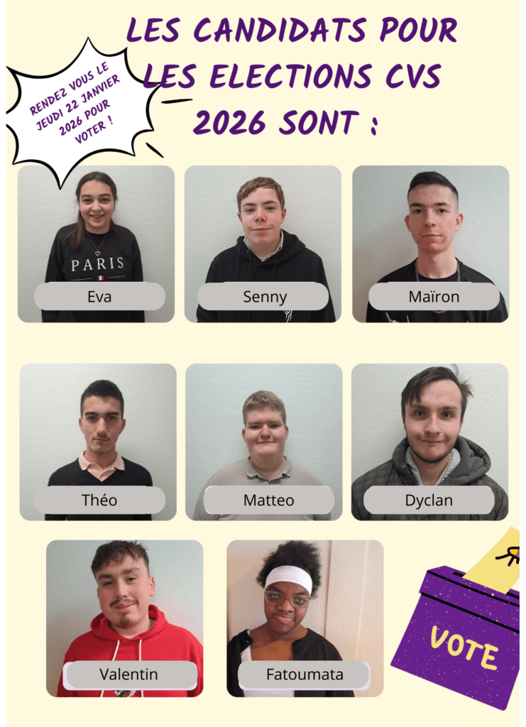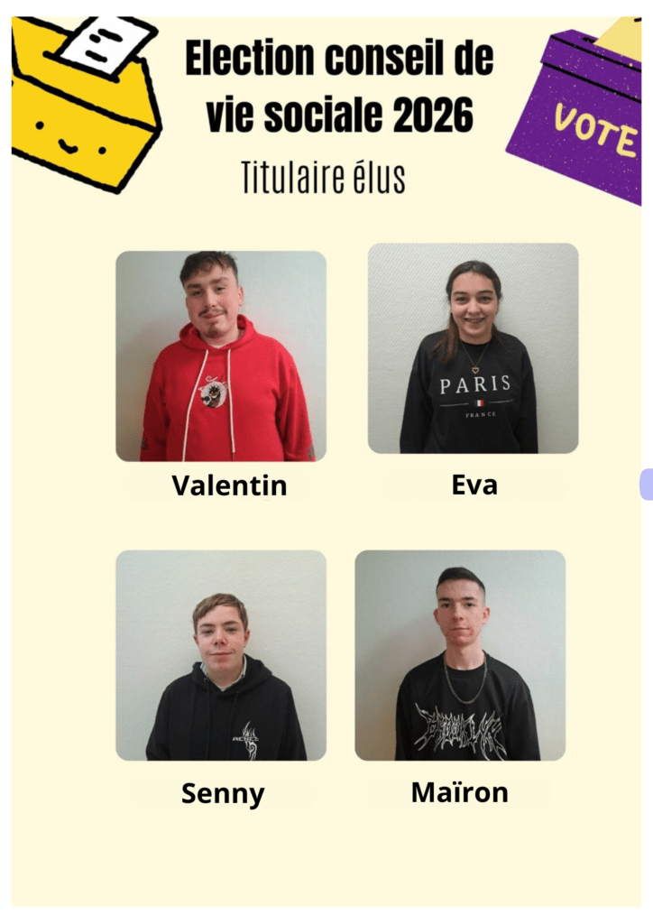 Le Jeudi 22 Janvier 2026, nous avons voté pour les candidats du Conseil de Vie Sociale de l’IME. Nous avons élu Eva, Valentin, Maïron et Senny pour nous représenter ! Bravo et merci à tous les candidats suppléants qui se sont présentés ! Merci aux jeunes qui ont participé à l’organisation des élections ainsi qu’à