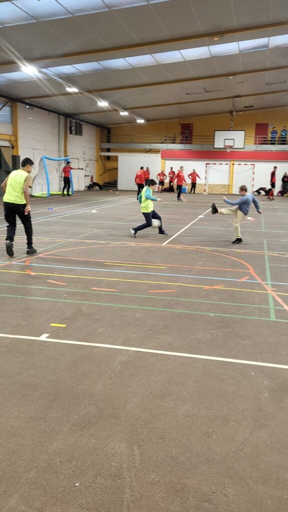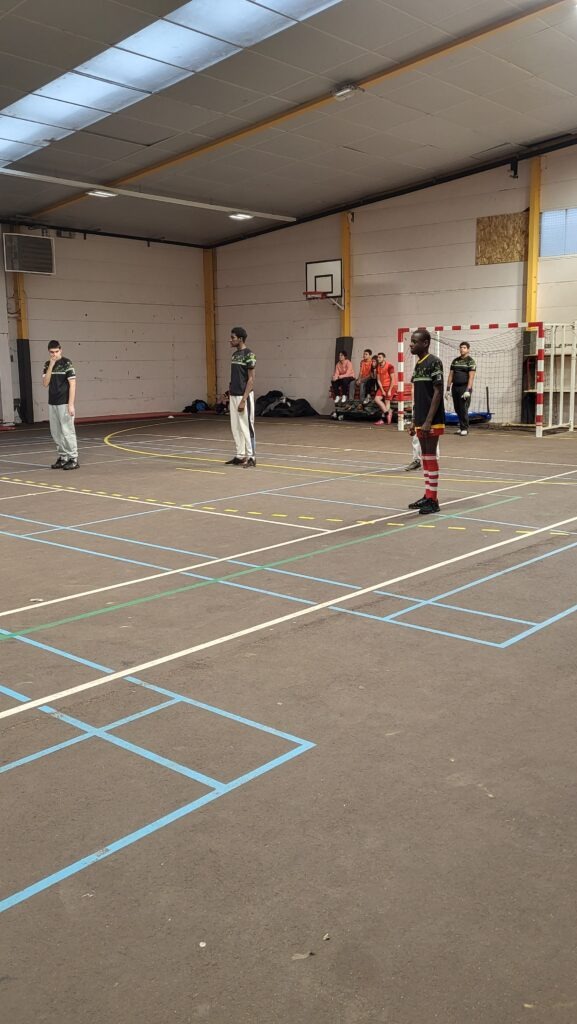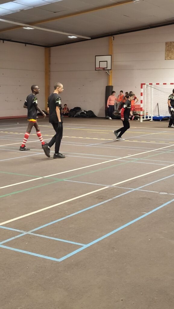 L’équipe est composée de plusieurs jeunes de l’IMPro et quelques « petits » de l’IMP. Chacun a son poste et le garde tout au long des séances. On retrouve en plus des joueurs un coach, un arbitre, un gardien et des remplaçants.